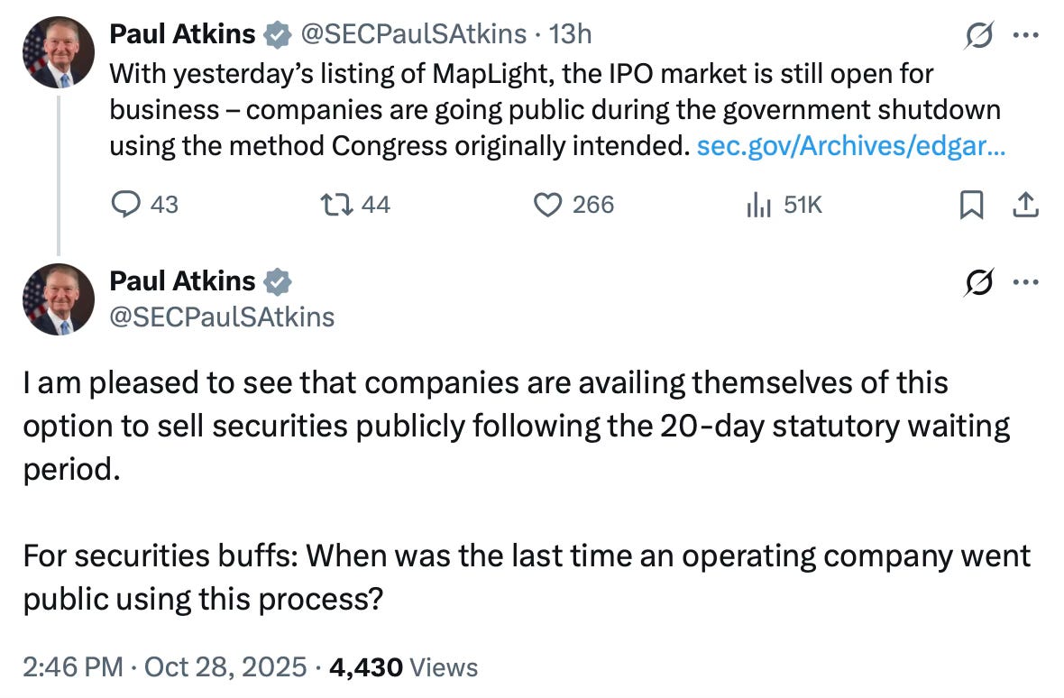 SEC Chairman Paul Atkins took to X to note he was pleased to see companies using the 20‑day statutory waiting period to go public during the shutdown, praising the same legal mechanism Bitwise and Canary Capital used to launch their ETFs.
