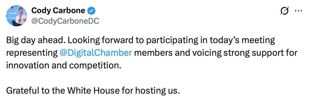 Quick recap: Provisions on stablecoin yield in the Banking Committee’s bill, which Coinbase said favored the banks too heavily, prompted the exchange’s CEO Brian Armstrong to withdraw support last month, causing the committee to delay its vote. The White House and the Banking Committee have told Coinbase, whose business depends more on stablecoin yield than most due to its deal with USDC issuer Circle, that it must reach an agreement with the banks before a new markup can be scheduled. This meeting is the first step.