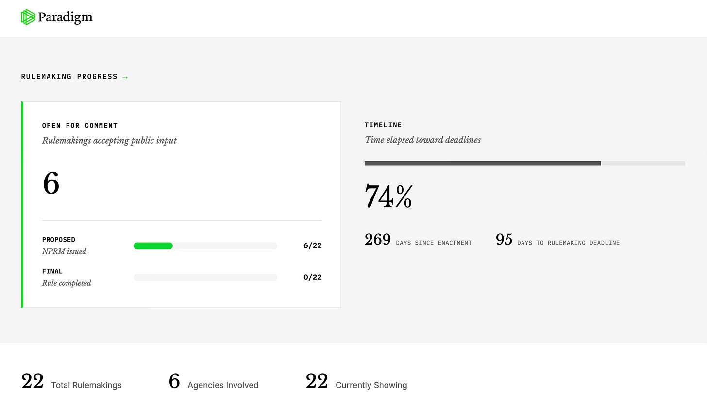 Paradigm just dropped a new dashboard tracking the 22 proposed rules across six federal agencies involved in the rulemaking process. It shows each rule’s stage, days since enactment and implementation timeline. Check it out here.