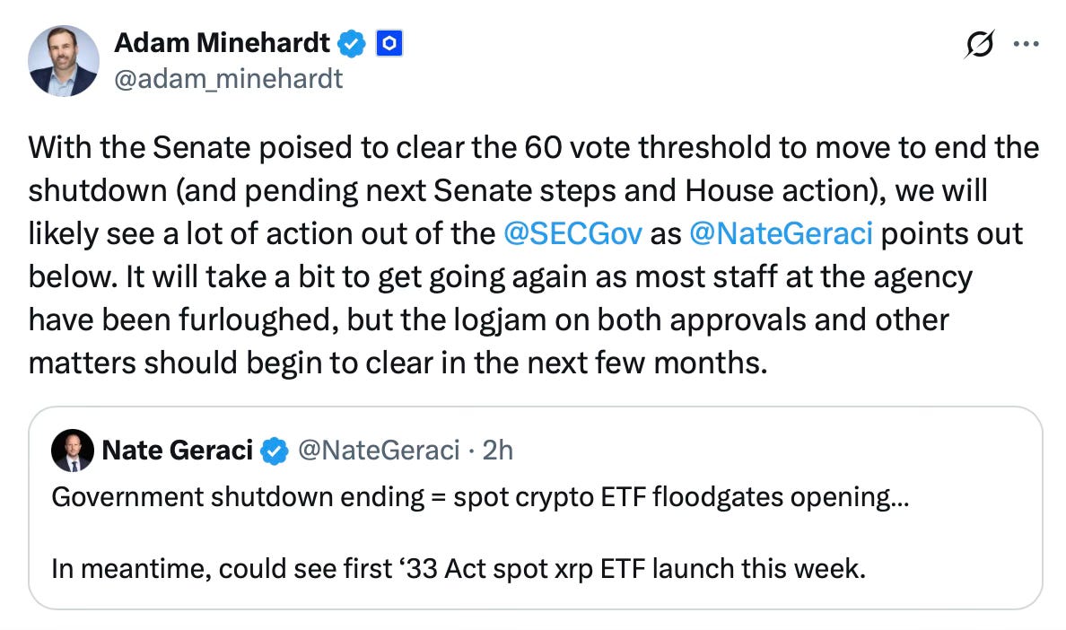 What you’ll read: What the government reopening means for crypto, the status of XRP spot ETFs, and what’s on our radar this week.
